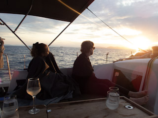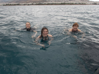 By now it was time to go on our Athens half-day sailing and sunset tour and so we returned to the apartment and all got a cab to get back to the same harbor we were at the night before. We got there a bit early so we walked around the dock a bit and then our guide was ready for us. Very personable (and really good-looking) young guy who was happy to tell us all about growing up in Greece, and answered all the questions we had about everything. His eyes were such an intense blue it was distracting and when he went below deck the girls and I said as much to each other. When he came back out he was wearing glasses! I don’t know if he heard us or it was a coincidence… The weather wasn’t great but we still went off the boat and into the water, and it was a really good excursion.